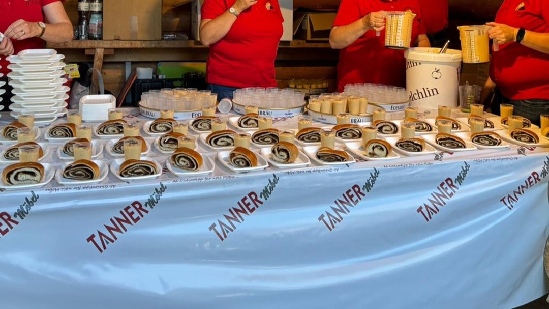 Nach dem Eintreffen auf dem Dorfplatz erhält jeder Teilnehmer gegen den zugesandten Gutschein das obligate Kaffeeglas im "Anhänge-Täschli" und eine Bon-Karte für die verschiedenen Posten auf der insgesamt 5 km langen Wanderung.